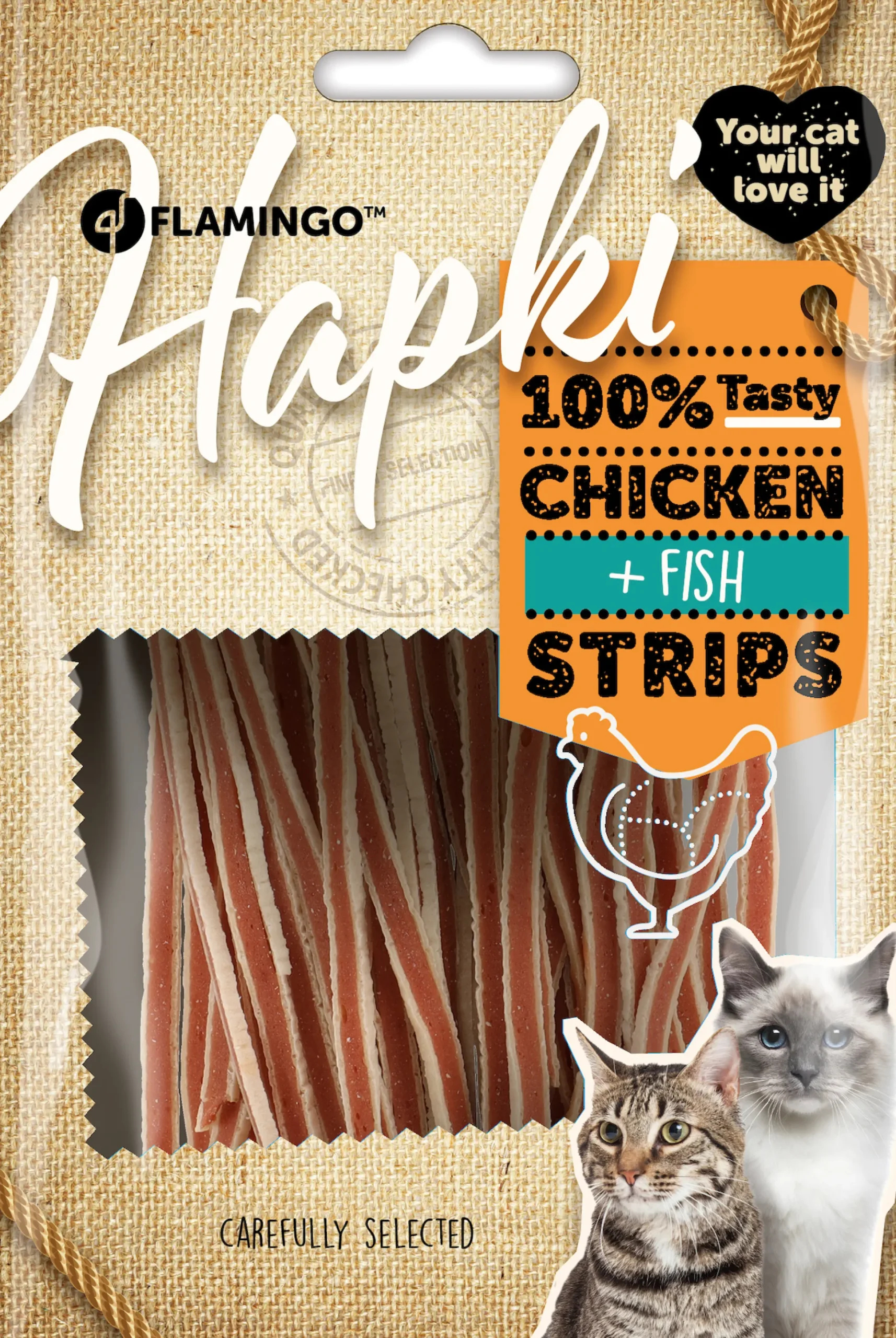 Kip (50,7%), pollak (13,8%), glycerine, plantaardig eiwit, sorbitol, zout, zetmeel, plantaardige olie, trehalose