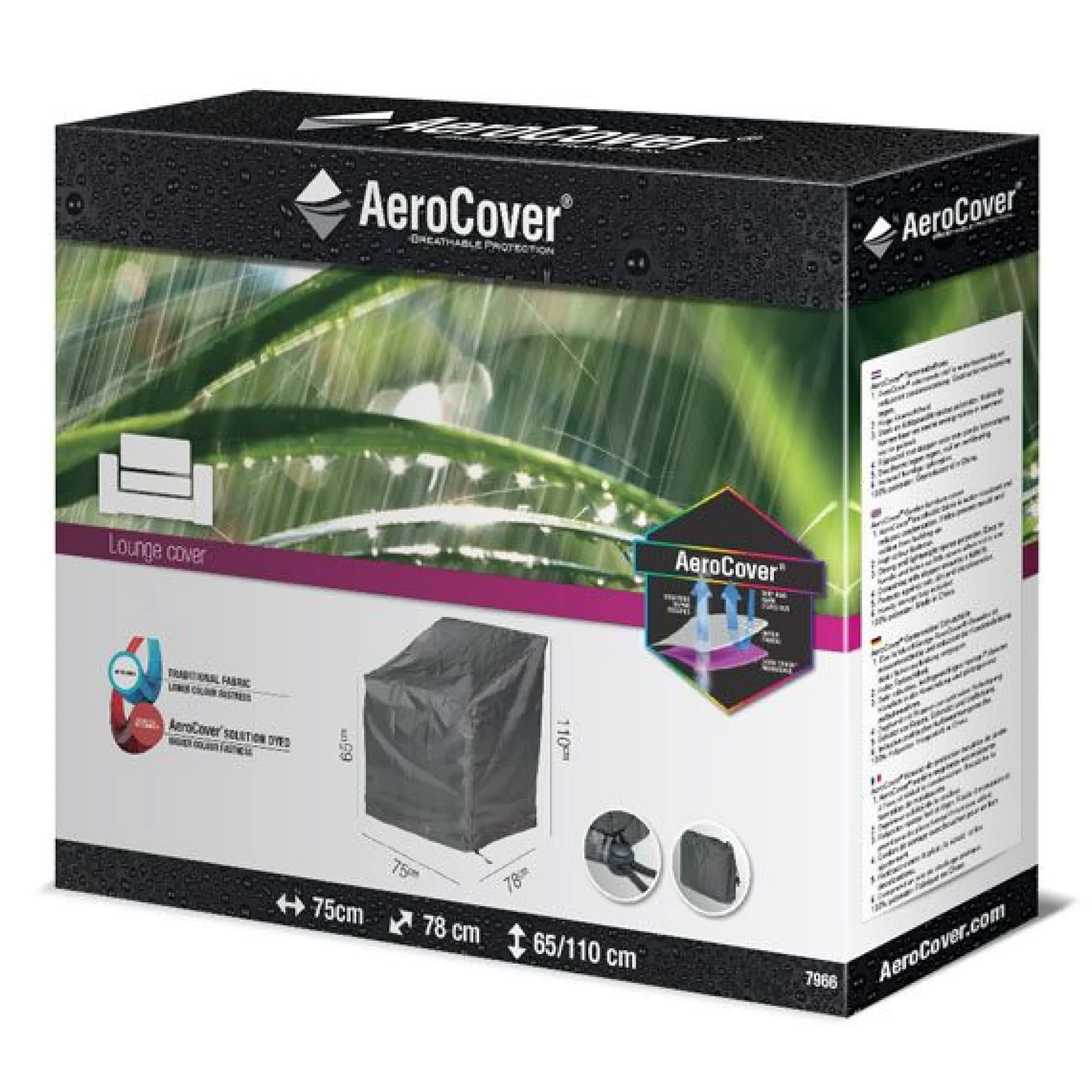Loungestoelhoes van AeroCover. Ademende loungesethoes voor lounge stoel 75x78cm met extra hoge rug tot 110cm.