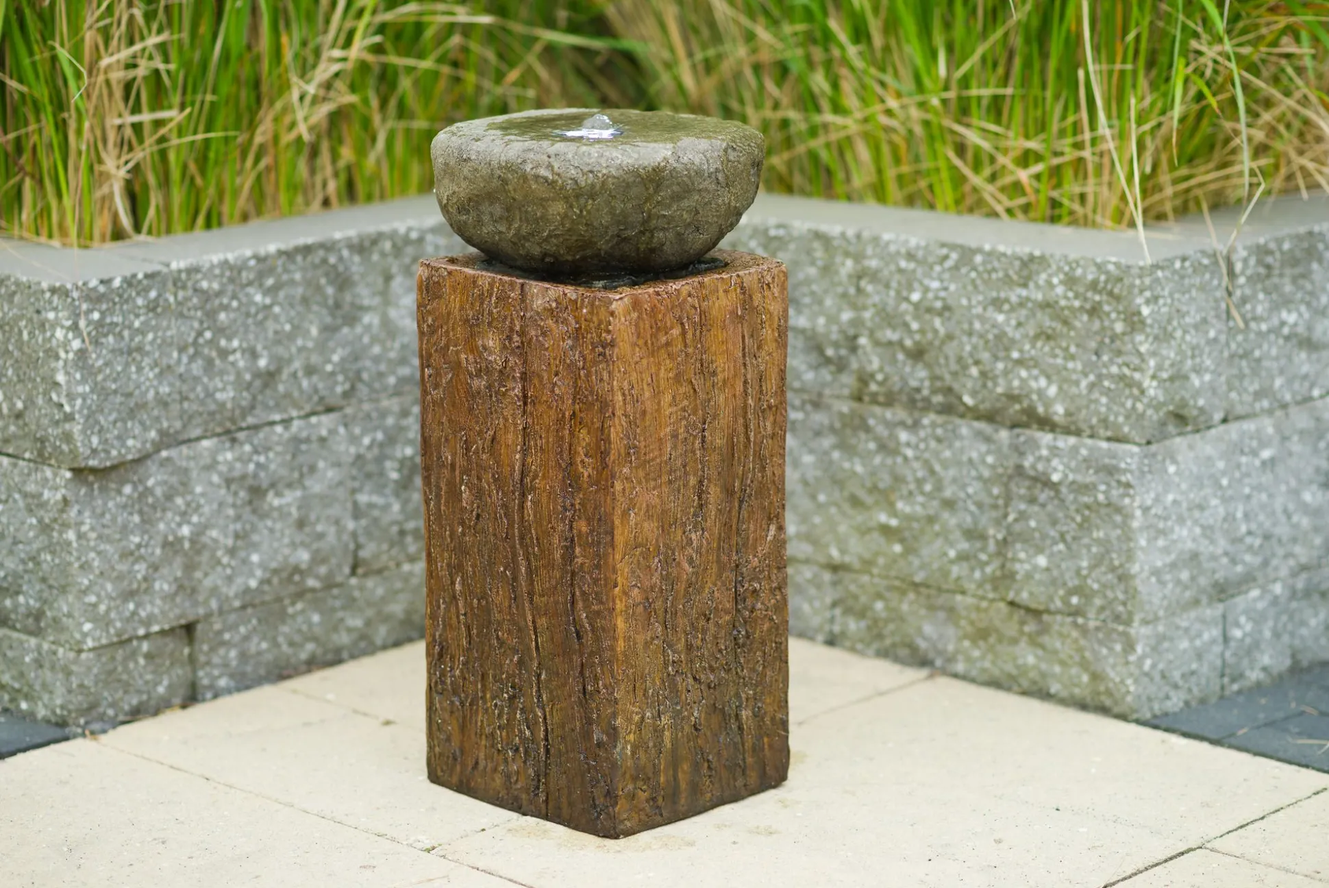 Dit waterornament voor het terras combineert een eikenhouten kolom met een rustieke stenen kom en ledverlichting, om uw balkon of terras meet cachet te geven.