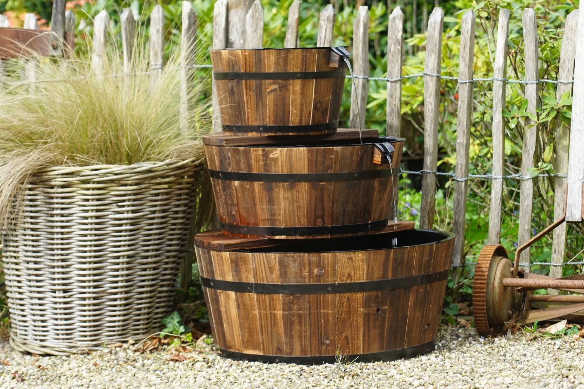 Dit houten waterornament voor het terras bestaat uit drie boven elkaar geplaatste houten vaten van verschillende grootte die het water in elkaar overstorten, waarbij het onderste vat als reservoir dient. Elk vat bevat een waterdichte binnenbak van pvc.