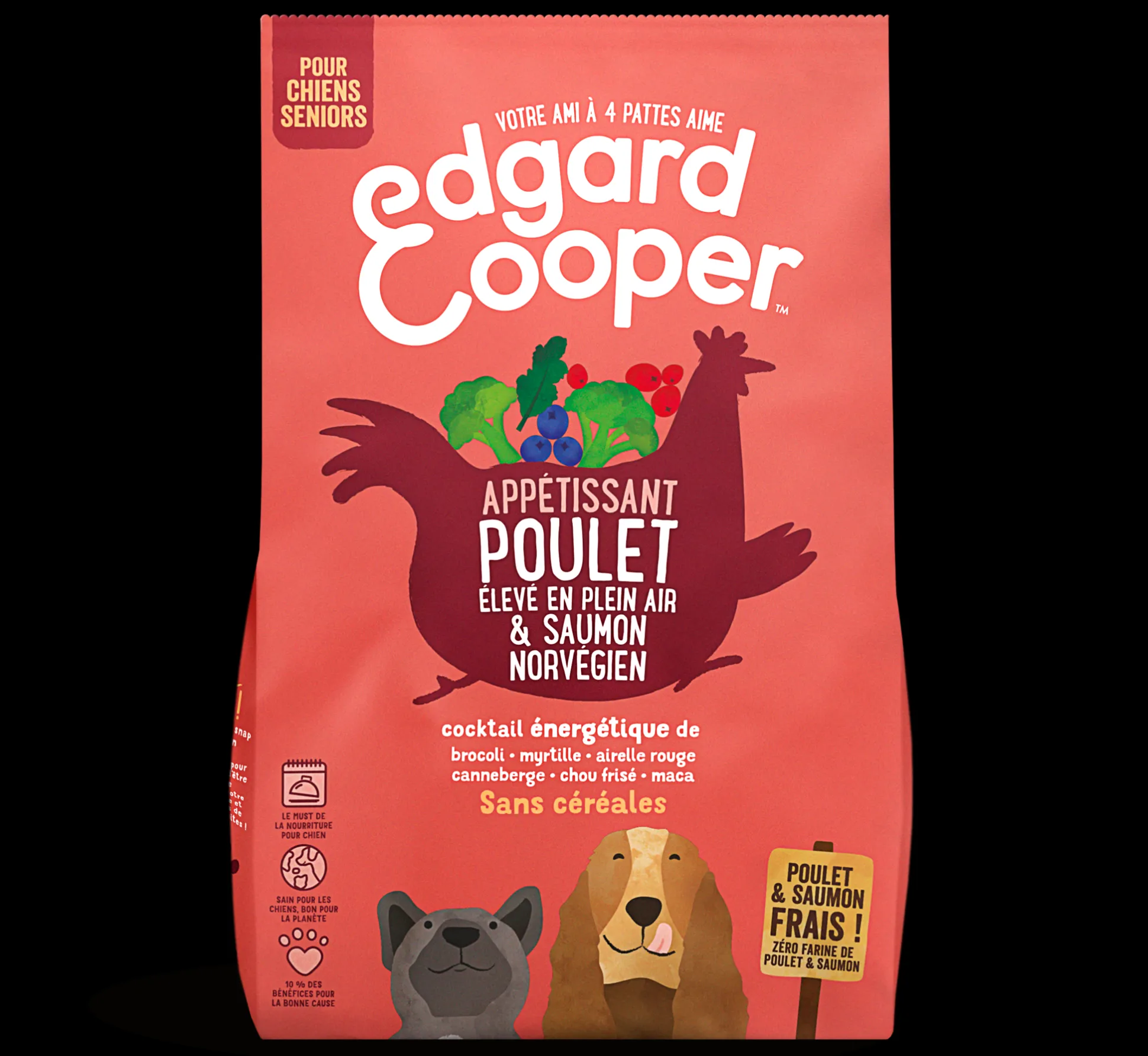 verse kip 35%, bataten, erwten, verse zalm 5%, lijnzaad, erwteneiwit, kippensaus, mineralen, mannan-oligosachariden (MOS), fructo-oligosachariden (FOS), broccoli 0,04%, bosbessen 0,04%, vossenbessen 0,04%, cranberry’s 0,04%, boerenkool 0,04%, maca 0,04%, goudsbloemblaadjes, brandnetel, braambesblaadjes, venkel, karwijzaad, kamille, melisse, glucosamine, chondroïtinesulfaat.